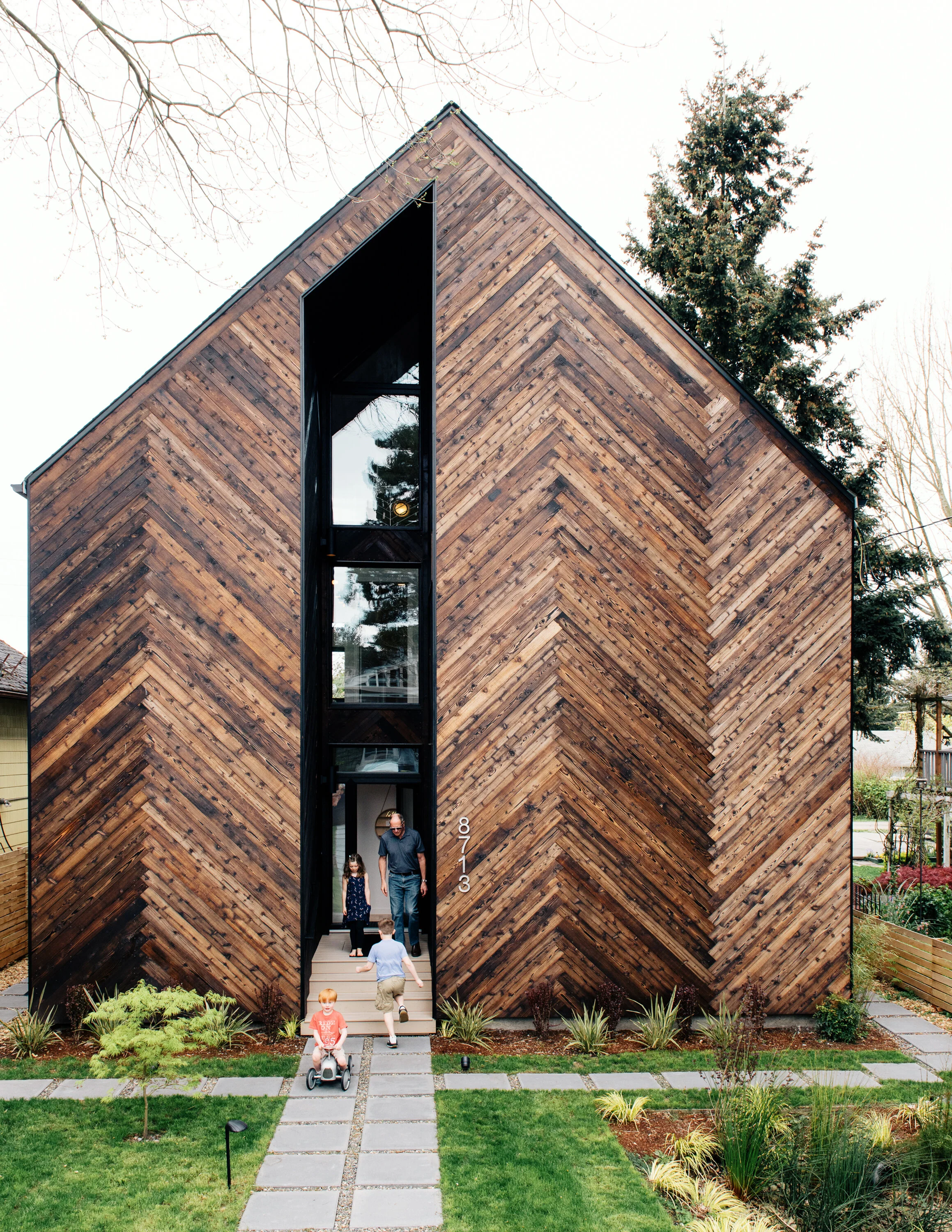 The unique façade is composed of hand-charred cedar in a herringbone pattern, adding a twist to a classic Northwest American building material. The dark patina complements the lush, tree-lined neighborhood streets, while the shou sugi ban treatment naturally seals the cedar, eliminating the need for regular maintenance in a rainy Seattle climate. Once inside, the large windows and white, minimal interior maximize natural daylight to create a light filled space that is private from the street.
